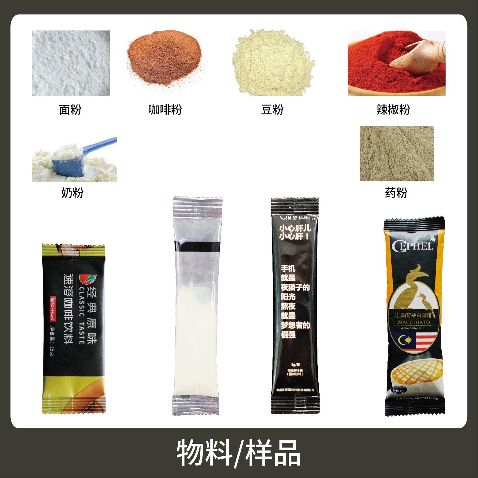 1、適用于食品、醫(yī)藥、化工、化妝品行業(yè)中粉劑物品的計(jì)量包裝,如:鹵料粉、奶粉、蛋白質(zhì)粉、咖啡粉等。