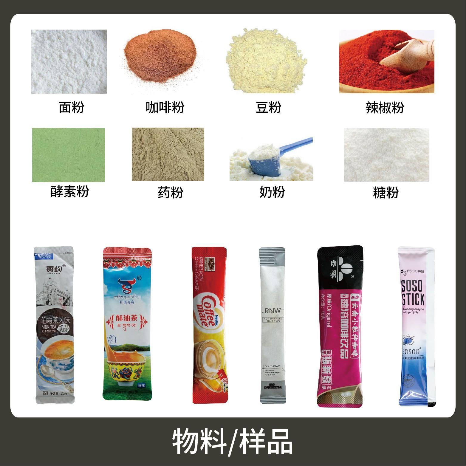 適用于食品、醫(yī)藥、化工、化妝品行業(yè)中粉劑等物品的計量包裝,如:奶粉、藥粉、咖啡粉等。